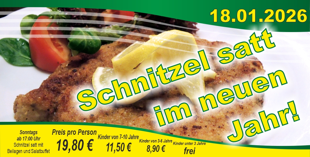 Auch im neuen Jahr starten wir wieder unsere Schnitzel-Satt-Aktion. Gold-gelb backenen Schnitzel warten wieder im Grünen Hof auf Euch. Mit dabei sind natürlich die leckeren Spätzle, Kroketten und Pommes-Frites und die kräftige Bratensauce. Dazu ein frischer Salat vom Buffet ... einfach zugreifen!